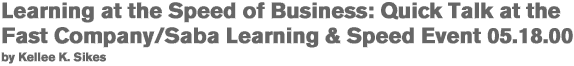 Many things bother me about the new economy, but the one thing that really gets my goat is the idea that everything in the new economy has to be f-a-s-t. With that mind set, I flew up to Chicago on May 18 for the Fast Company and Saba sponsored forum “Learning and Speed in the New Economy,” daring them to show me why I should value speed. Learning and Speed: A View from a Speed Curmudgeon“It’s not about be f-a-s-t it is about make f-a-s-t.” >> - Thornton May, Panelist and Vice President/Corporate Futurist at Cambridge Technology Partners Ironically, the pilot for the flight out to Chicago must have known how I felt about speed because for the first time in twenty years, he showed up an hour late. Due to our synchronized thought, I entered the great hall of Café Brauer in Lincoln Park late and lingered in the doorway scanning the linen covered tables for an empty space. “The worst thing you can do is waste anyone’s time late to meetings, etcetera.” - J. Neil Weintraut, Panelist and General Partner of 21st Century Internet Venture Partners. For a moment, caught in the doorway, I could not help but take in the tempo contrast of the Prairie School architecture (polished wood floors reflecting the cool greens of the park outside visible through giant windows, capped by a lofty, oval-arched, wooden ceiling) to the rapid-fire discussion of the panelists well under way. Sigh. I took a depth breath and resigned myself to the fact that although the atmosphere looked as if it were made for languishing, I was now entering the zone of New Economy Speed. I nabbed a spot and settled in. “We live in multiple speed zones; hours, minutes, days, weeks…objectives and focus are what often frees up time.” - Ray Blair, Panelist and Director of e-Procurement at IBM An audience member tossed out a question as the panelists took a breather from the opening discussion: “How do you determine what you need to forget?” Thornton May seized the question and explained that it all revolved around the idea of making fast, not the idea of being fast. With making fast as a foundation, it is acceptable to toss out anything that does not lead you to make fast. You ask yourself, “Can I use the information to make core processes fast, make talent fast, make new markets fast, make learning fast, all to make the organization as a whole fast?” With